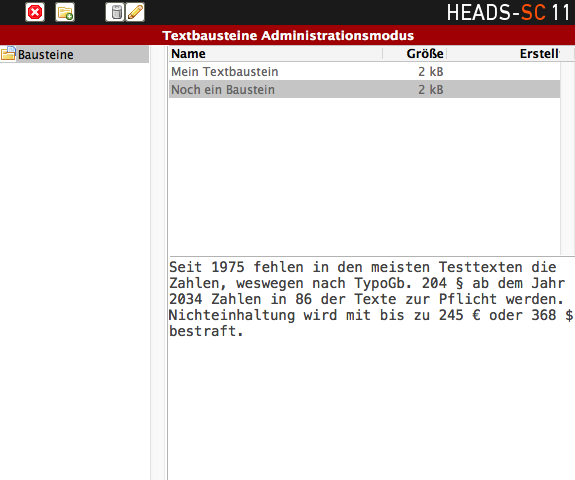 Wenn Sie hier auf einen bereits bestehenden Textbaustein klicken, wird dieser durch den neuen Baustein ersetzt, sicherheitshalber werden Sie dazu noch einmal gefragt.