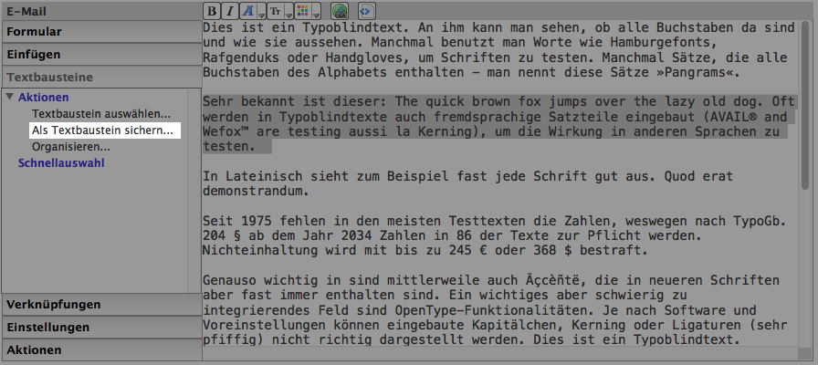 Um neue Textbausteine zu definieren, selektieren sie die gewünschte Textpassage und klicken Sie auf Als Textbaustein Sichern.