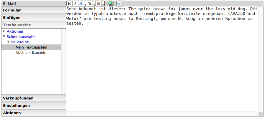 Für den Zugriff auf Textbausteine wählen Sie in der Aktionsleiste links neben dem Editor den Bereich Textbausteine aus.